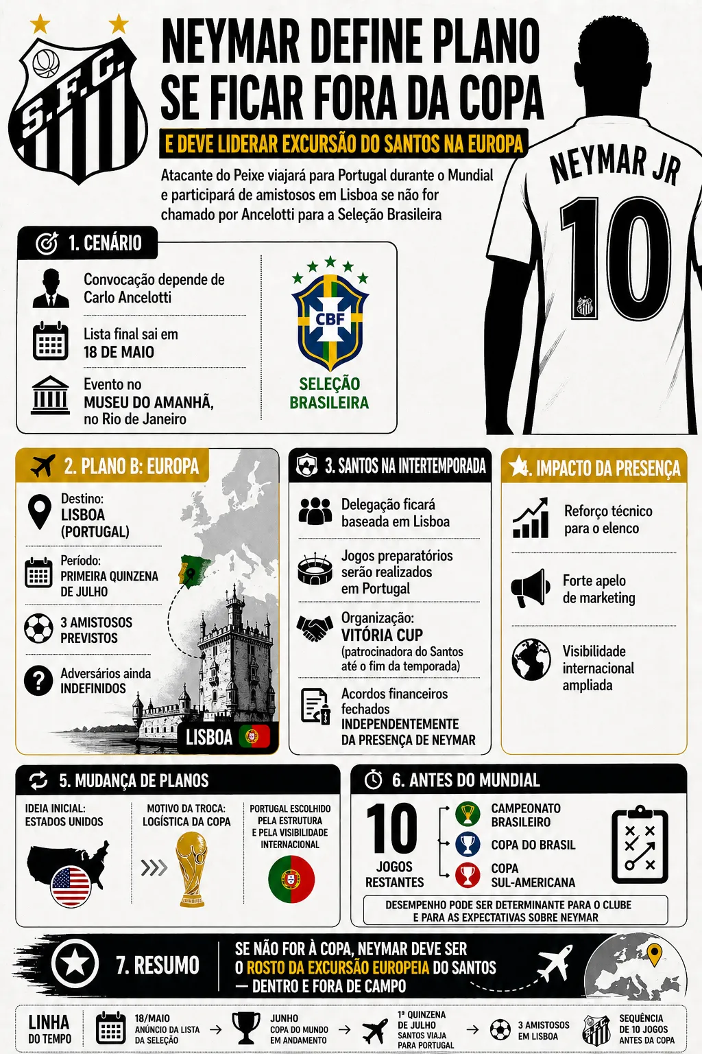 Atacante do Peixe viajará para Portugal durante o Mundial e participará de amistosos em Lisboa se não for chamado por Carlo Ancelotti para a Seleção Brasileira O futuro de Neymar para a Copa do Mundo já tem um plano traç...