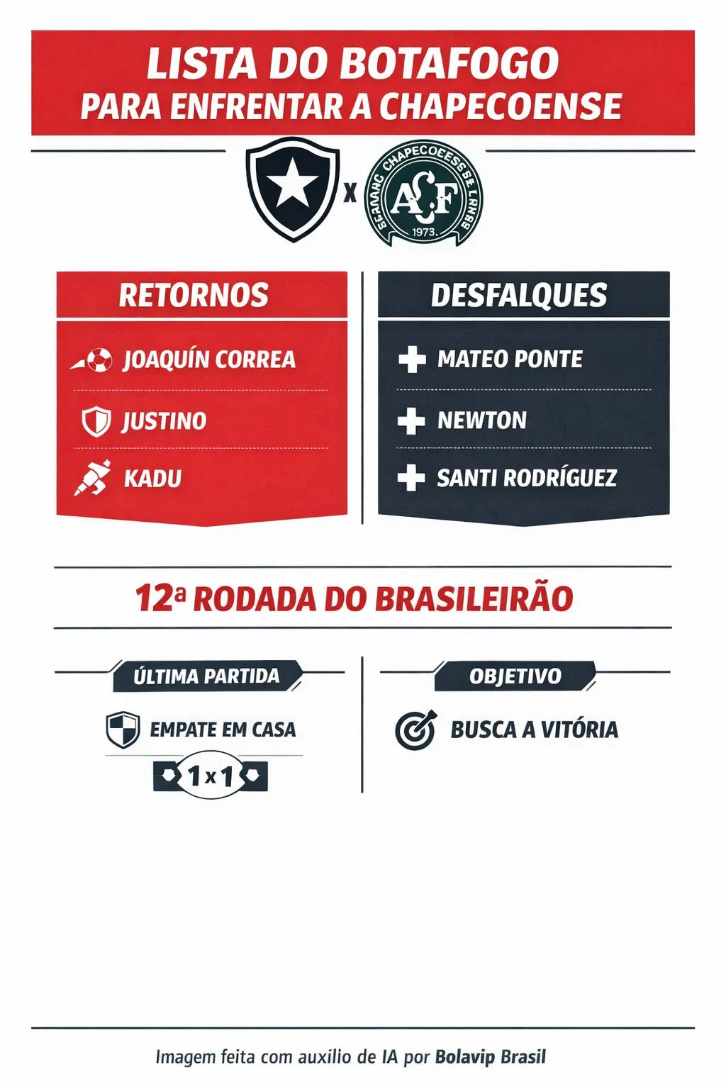 A lista também traz novidades importantes. O zagueiro Justino e o lateral-direito Kadu retornam após ficarem fora dos últimos compromissos, ampliando as opções defensivas do time.
