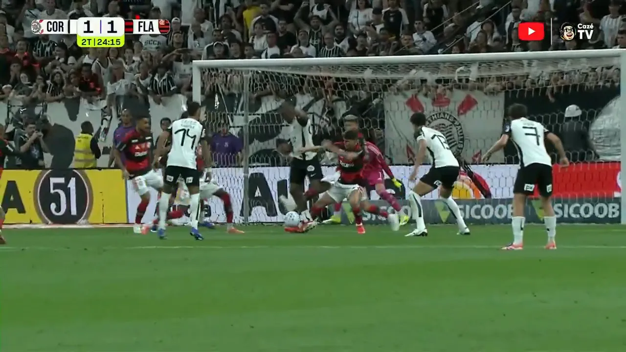 Sobre o lance dentro da área entre Ayrton Lucas e André, o comentarista pontuou que o lateral flamenguista calçou o volante corintiano com a perna direita.