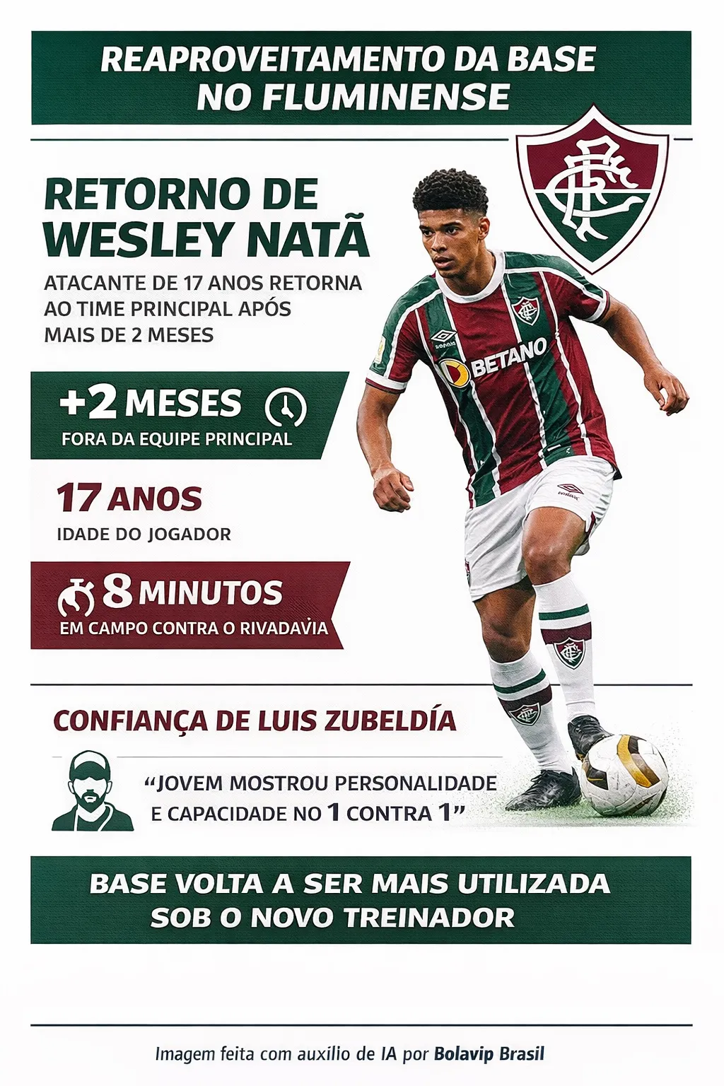 O Fluminense ganhou um ponto de atenção positivo mesmo após a derrota para o Independiente Rivadavia pela Libertadores. A reestreia de Wesley Natã, após mais de dois meses sem atuar, marcou o retorno da base ao time principal sob o comando de Luis Zubeldía.